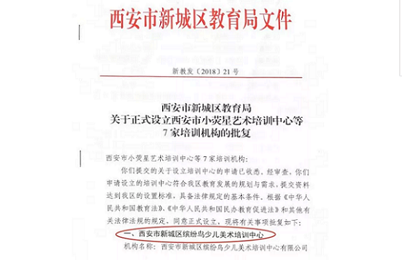 西安市新城缤纷鸟培训中心与西安市新城区缤纷鸟少儿美术培训中心有限公司并非同一培训中心。我们的全称为:西安市新城区缤纷鸟少儿美术培训中心有限公司,是经西安市新城区教育局批准,合法经营的一家教育培训机构,批复文件见新教发[2018]21号文件